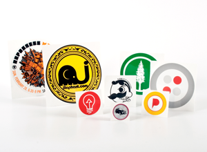 Autocollants imprimé couleurs recto seulement (4/0 CMYK) sur papier autocollant semi-lustré .003 mil. Pour usage intérieur, sans contact avec l'humidité